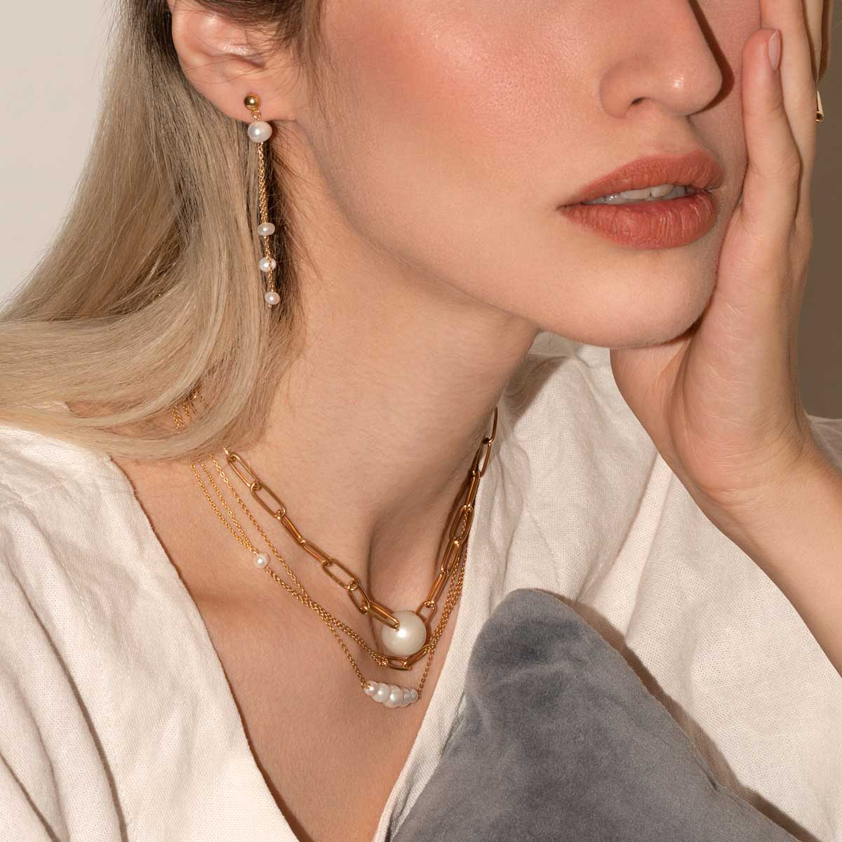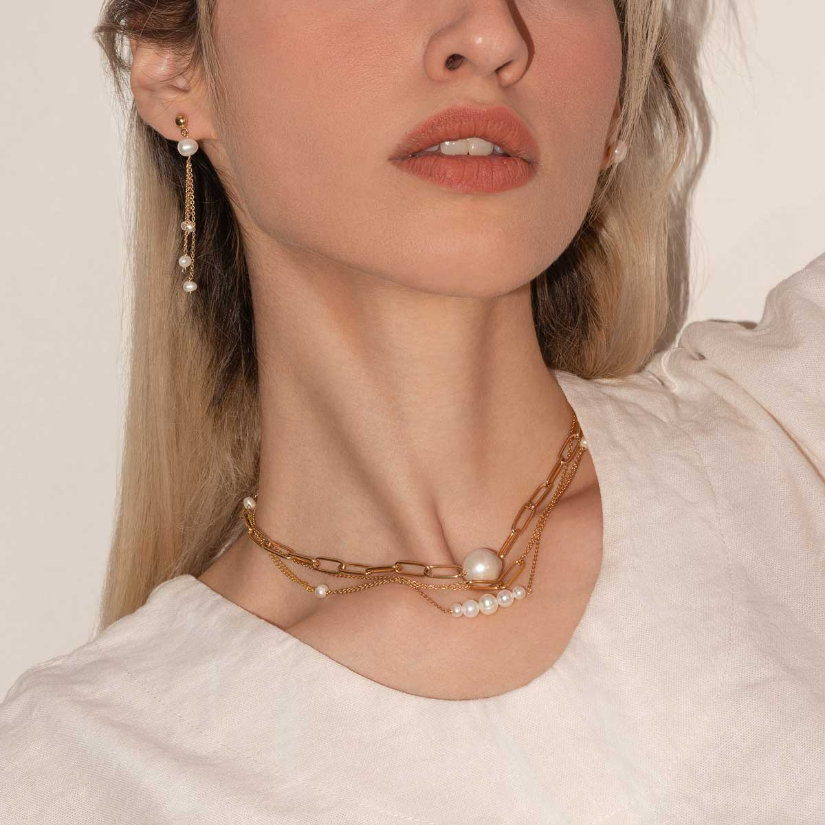رنگهای سفید و زرد مروارید در این گردنبند نیز ترکیب زیبایی ایجاد میکنند. مروارید سفید به طور سنتی نماد خالصی و ظرافت است، در حالی که مروارید زرد بیشتر به شادابی و انرژی مرتبط است. این ترکیب رنگی به گردنبند زیبایی خاصی میبخشد و میتواند به راحتی با انواع لباسها و استایلها هماهنگ شود.