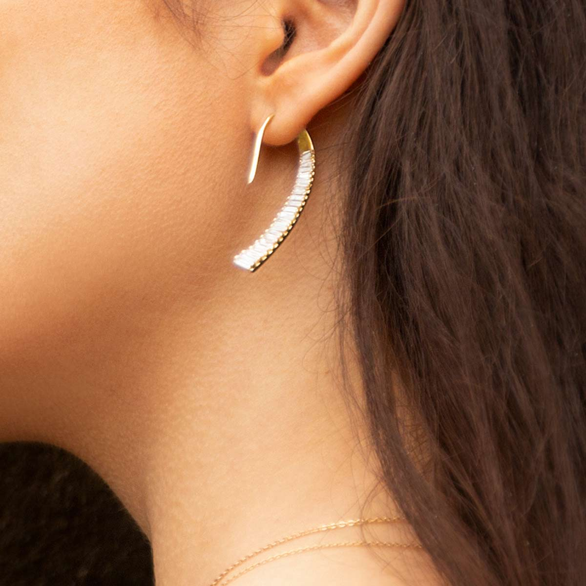 گوشواره طلا موج و نگین باگت یک طراحی مدرن و شیک دارد که ترکیبی از موجهای ظریف و نگینهای باگت در آن به کار رفته است. نگینهای باگت به صورت مستطیلی و درخشان در این گوشوارهها استفاده شدهاند که جلوهای خاص و لوکس به آن میبخشد. این گوشواره در وزنهای 3 گرم و 4 گرم و در رنگهای سفید، زرد و رزگلد موجود است. هر رنگ طلا، ظاهری متفاوت و جذاب به گوشواره میدهد و به راحتی میتوان آن را با استایلهای مختلف تطبیق داد. این گوشوارهها برای مناسبتهای خاص یا استفاده روزمره انتخابی عالی هستند.